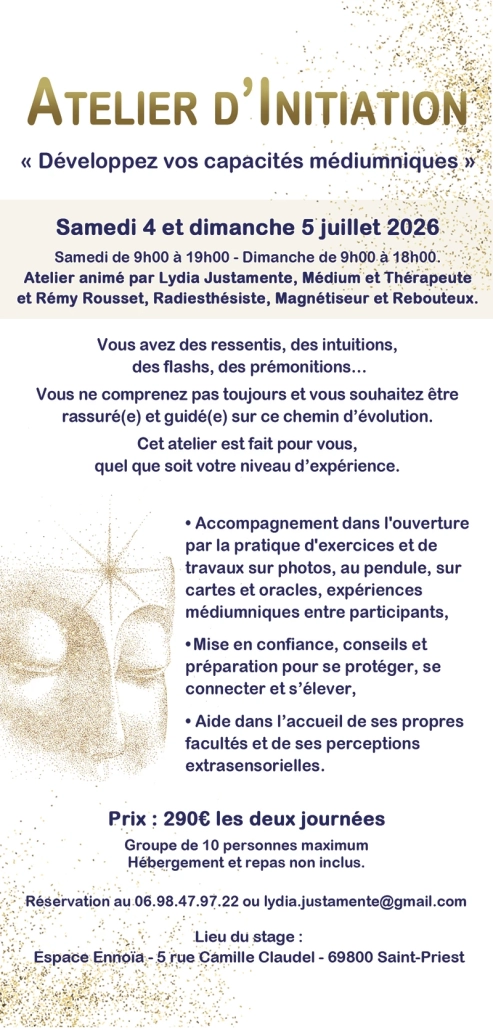 Vous êtes doté(e) de facultés extrasensorielles, mais vous ne savez pas comment les développer et quelle voie initiatique vous pouvez emprunter ? J’ai donc créé cet atelier afin de vous accompagner sur ce chemin d’éveil et d’érudition.